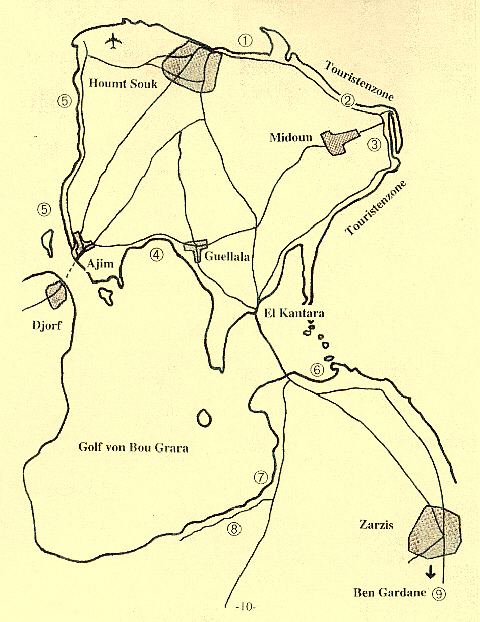 die Wassertiefe 9 Kilometer vor der Küste von Houmt Souk, dem Hauptort Djerbas, lediglich 5 Meter! Bei Ebbe werden deshalb immense Schlickflächen frei, welche von